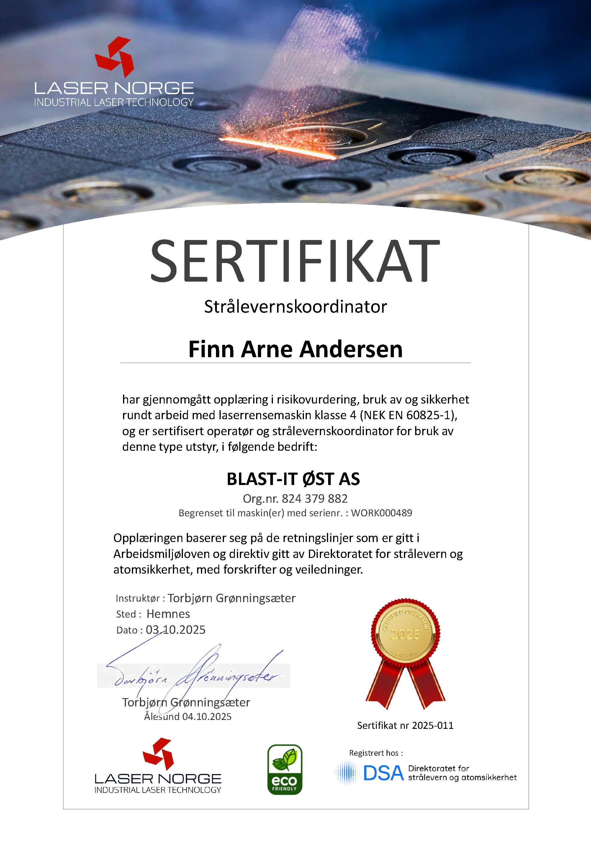 Sertifisering av ansatte - ved kjøp av maskin sørger Blast-It Øst for godkjent opplæring og sertifisering for opptil tre ansatte hos din bedrift.